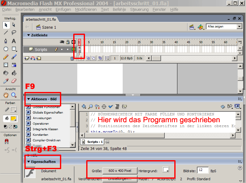 Wenn der untere Bühnenrand erreicht ist, wird sowohl der Event-Handler für onEnterFrame als auch für onMouseDown gelöscht. Dadurch reagiert das Programm nicht mehr auf einen Mausklick und die Linie bleibt am unteren Bühnenrand stehen. Der Wahrheitswert von moving wird wieder umgedreht und enthält jetzt den Wert false, was bedeutet, dass die Linie still steht.